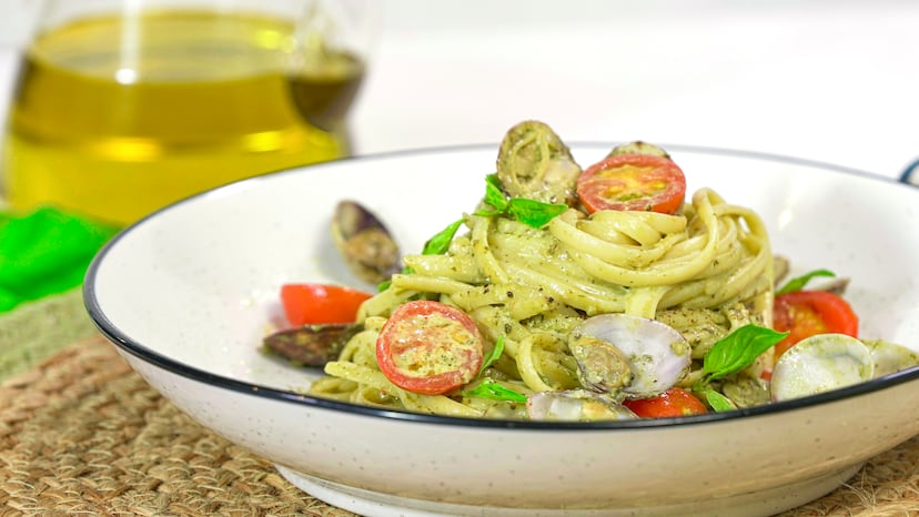 La versión genovesa de la famosa salsa italiana hace subir puntos a esta receta de linguine, en la que las almejas ponen el sabor a mar y los tomatitos, la frescura.
