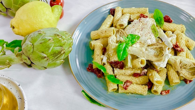 Los tortiglioni son una pasta corta cuyo rayado exterior se impregna muy bien de salsas como el pesto. Nuestra receta los acompaña con burrata, alcachofas y tomate seco, y es perfecta si buscas un plato fresco