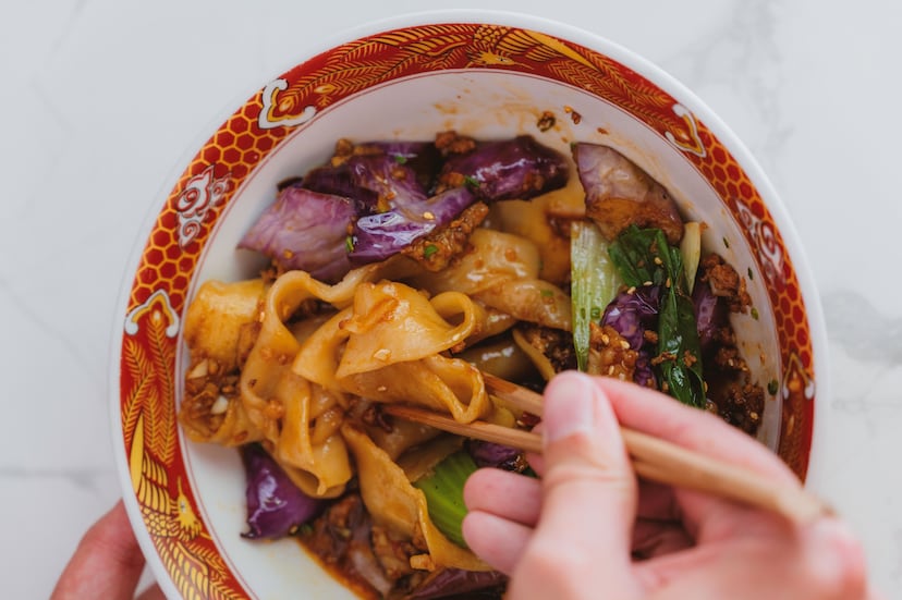 Un pequeño local de Chueca triunfa en Madrid sirviendo biang biang, unos fideos chinos anchos y larguísimos típicos de Xian. Su dueño nos enseña cómo se hacen a mano y nos regala una receta con berenjenas