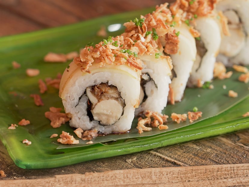 Colocar una hoja de alga nori de 10 x 20 cm encima de una esterilla de bambú recubierta con film. Poner encima 120 g arroz, una tira de foie gras de anacardo, setas shiitake y cebolla caramelizada. Cerrar el sushi (ver vídeo).
