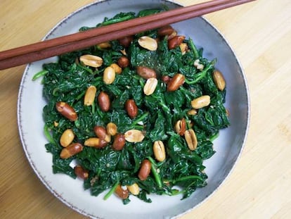 Podríamos escribirle una carta de amor a las cremas de verduras, que por la sencillez de su preparación, su enorme versatilidad y por la cantidad de cenas nos salvan a lo largo del año, bien merecida la tendrían. En esta en particular, las espinacas son las protagonistas, y las cocemos durante poco tiempo para que conserven su sabor y su color verde radiante. ¿Puedes utilizar espinacas congeladas? Sí, aunque en mi opinión queda mucho mejor con espinacas frescas, que puedes conseguir ya lavadas y hasta troceadas si lo que te frena es la pereza. Van acompañadas de un poco de ajo, cebolla y apio –este último, totalmente opcional– para dar más sabor y patata para darle cuerpo (también podrías usar alubias blancas cocidas).