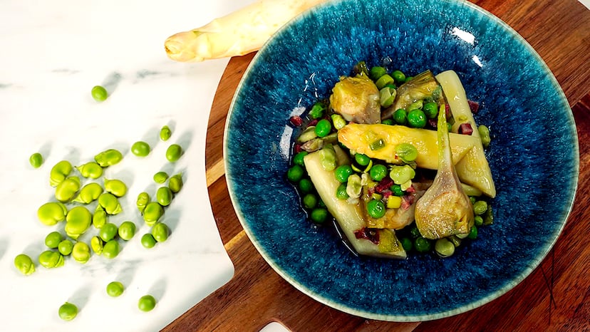 El plato aprovecha el momento en que cuatro verduras están en temporada: espárragos, alcachofas, guisantes y habas. Esta es la manera de que todas queden al punto