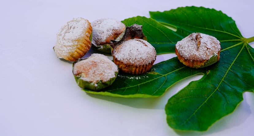 Preparar 14 moldes de magdalena colocando un trozo de hoja de higuera en la base.