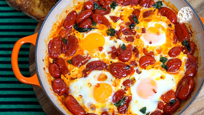 Esta preparación es originaria de Nápoles, pero bien podría relacionarse con los huevos al plato españoles de toda la vida. El proceso es muy parecido: una base de verduras en una sartén o cazuela baja —en este caso, tomate alegrado con ajo y guindilla— y unos huevos cascados en encima que se cocinan tapados hasta que la clara cuaja y la yema queda cremosa. Fin. Aquí los hemos preparado con tomatitos pera, pero se pueden hacer con otra variedad o con tomate de bote picado o triturado. También nos hemos salido un pelín del canon tradicional añadiendo un par de anchoas para subir el sabor, que se pueden sustituir por tomates secos bien picados si quieres un plato vegetariano. Para aprender esta facilísima preparación, no tienes más que mirar el vídeo de arriba.