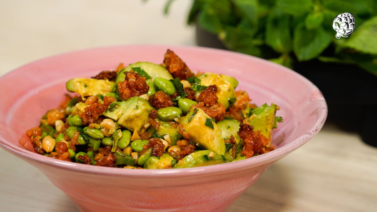 El truco sólo tiene un ligero problema: si sigues los tiempos de cocción de muchas recetas de TikTok, los granos de arroz se transforman en perdigones y puedes poner en riesgo tu salud bucodental. Superado ese drama, el arroz crujiente se puede usar en cualquier tipo de combinación, pero queda especialmente bien en ensaladas de airecillo asiático. Nuestra mezcla de ingredientes se basa en la de @sivanskitchen, tan fresca como completa.