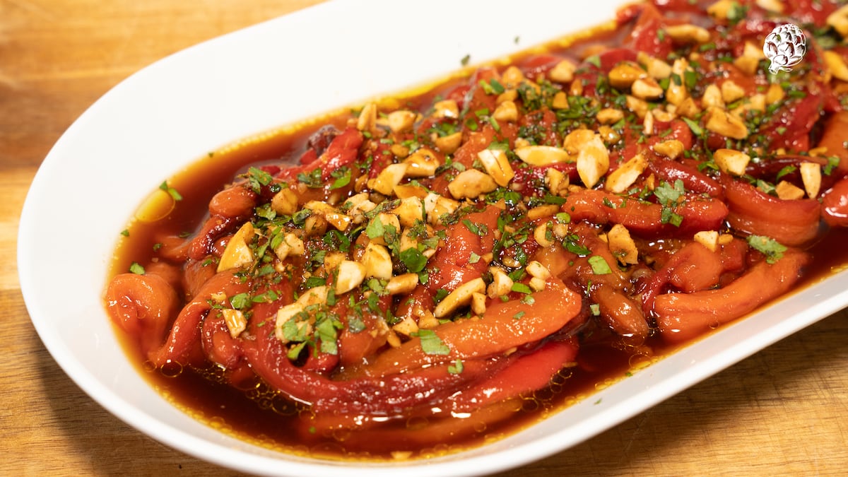 En nuestra receta hay, además, algunos trucos para potenciar al máximo el placer al comerlos: un aliño con un airecillo oriental que logra que todo suba, una reducción sencilla de su propio líquido que parece caramelo, y un remate con almendras fritas picadas que pone un plus crujiente. El aliño y el topping pueden ser usados con pimientos de bote, pero esto no lo hemos dicho nosotros, lo habrás leído en alguna otra parte. Si quieres ver cómo se prepara todo, mira el vídeo de arriba.
