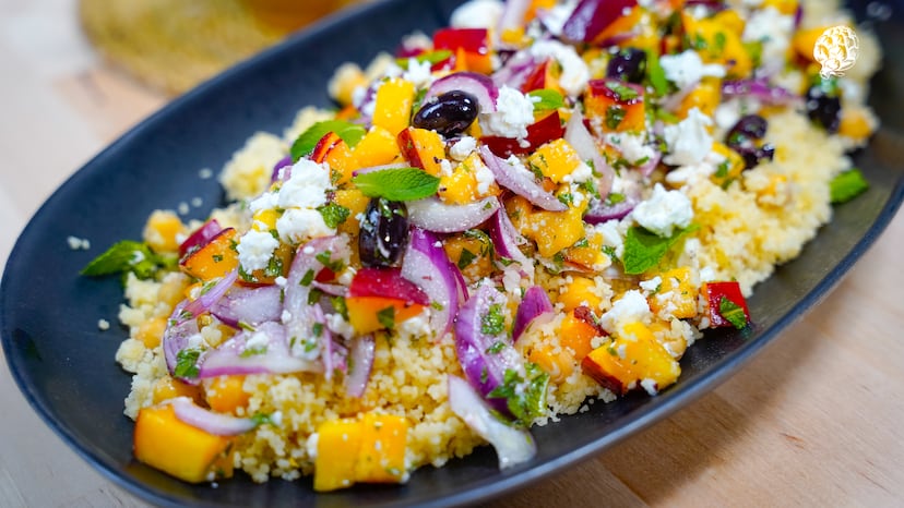El “cuscús de fiesta” es un plato veraniego completo, fácil de preparar y muy adecuado para llevar a cualquier parte. Su combinación de elementos jugosos, crujientes, dulces y salados engancha