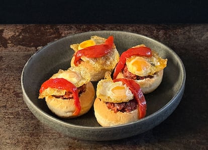 Es la especialidad del bar El Muro y lleva picadillo de chorizo, huevo de codorniz frito y una tira de pimiento asado dentro de un bollito de pan