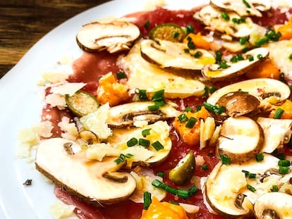 Ternera cruda cortada muy fina, champiñones Portobello, parmesano en lascas y puré de boniato especiado con ras el hanout: la receta de hoy es una celebración del otoño por todo lo alto.