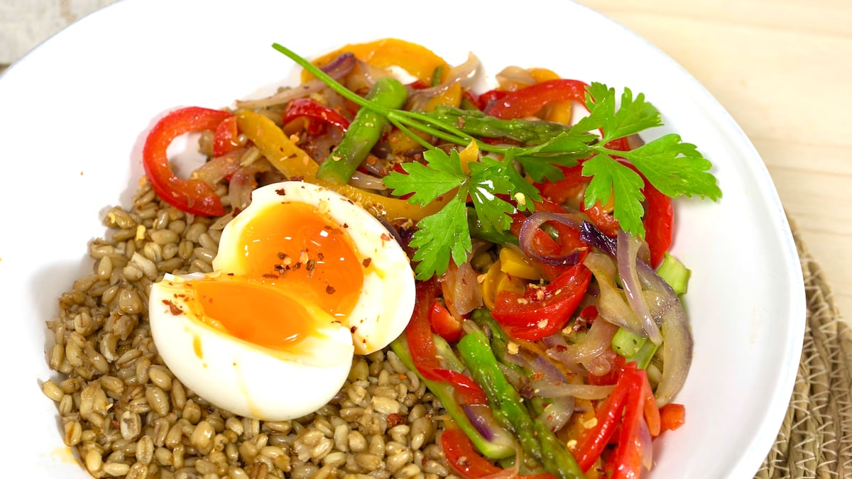 Servir la avena salteada en boles individuales. Añadir el salteado de verduras, una ramita de perejil y el huevo pelado y cortado por la mitad.