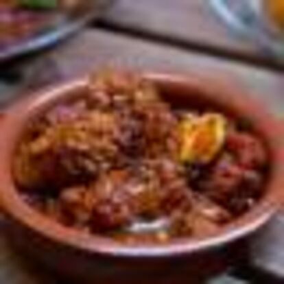Este tajín está inspirado en el del restaurante Moro, en el que el rape se asa con pasas, cebolla, patatas y especias.