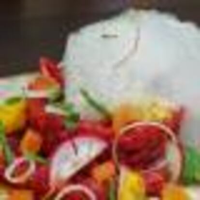 Esta receta se inspira en la técnica y los aderezos del cebiche, pero yo diría que está más cerca de la ensalada que de otra cosa.