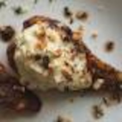 Fruta asada y caramelizada sin azúcar añadido, un chocolate potente y una crema con un toque suave de queso azul.