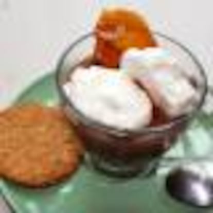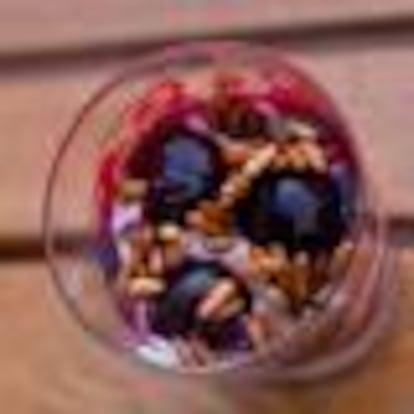 Las claves de esta adaptación mediterránea de un clásico británico son la corta cocción de las cerezas y el contraste con el yogur y los piñones crujientes.