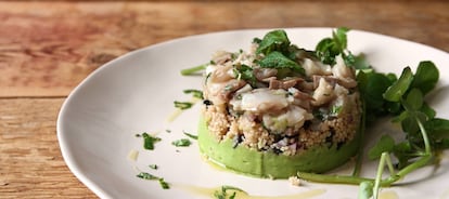 Uno de los retos de esta receta es el cuscús. No hay cosa más fácil que lograr que salga suelto, pero siempre que hablo con alguien al respecto se queja de que no le queda bien. El truco está en medir bien el volumen de cuscús que vamos a poner y usar el mismo de agua. Ojo, que estoy hablando de volumen, no de peso: cuando sepas la cantidad de cuscús que vas a utilizar, ponla en un vaso y marca hasta dónde llega (también puedes utilizar un vaso medidor). Quita el cuscús del vaso y llénalo de agua hasta la marca que has hecho, calienta esa cantidad de agua con una pizca de sal y cuando empiece a hervir, echa el cuscús, apaga el fuego y tapa el recipiente. Cuando hayan pasado dos o tres minutos, destapa, añade un chorrito de aceite de oliva y separa el cuscús con un tenedor hasta que se suelte. Pásalo a un plato o bol para que se enfríe y listo.