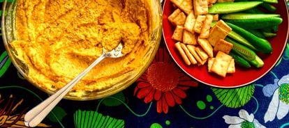 ¿Hay aperitivo más sencillo, rico y apañado que el hummus? No lo creo. Además es barato, le gusta a casi todo el mundo y, si te cansas de la versión tradicional, siempre puedes tunearlo (como hicimos hace un tiempo usando remolacha y hierbabuena). Llevaba tiempo pensando que la textura y el sabor de la calabaza o la zanahoria asadas podían irle muy bien, y decidí intentarlo con las segundas. El resultado fue estupendo, un poco más ligero que el hummus de garbanzo solo pero igual de untuoso, y con el sabor ligeramente tostado de las zanahorias asadas.