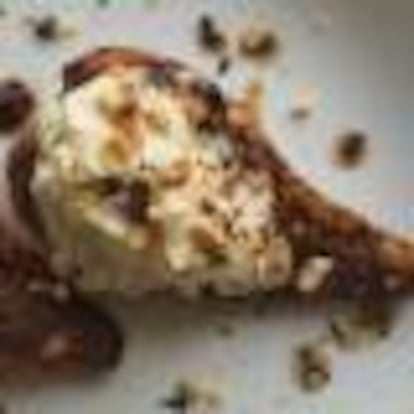 Fruta asada y caramelizada sin azúcar añadido, un chocolate potente y una crema con un toque suave de queso azul: un jetapostre de escándalo.