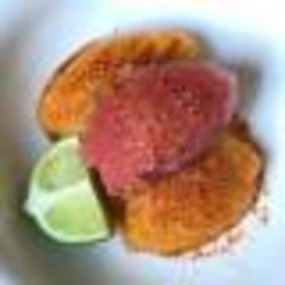 Este tataki utiliza una técnica oriental, pero unos ingredientes muy mediterráneos, y le da la vuelta al tradicional para jugar a a favor del sabor.