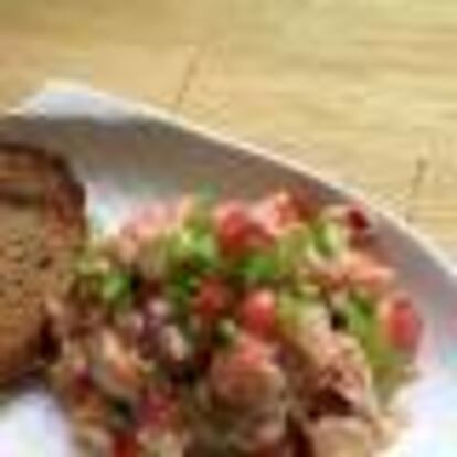Un tartar de pescado con frutas de temporada, facilísimo de convertir en ensalada añadiéndole un lecho de hojas verdes –por ejemplo, rúcula o escarola– y una vinagreta sencilla a base de de aceite y limón.