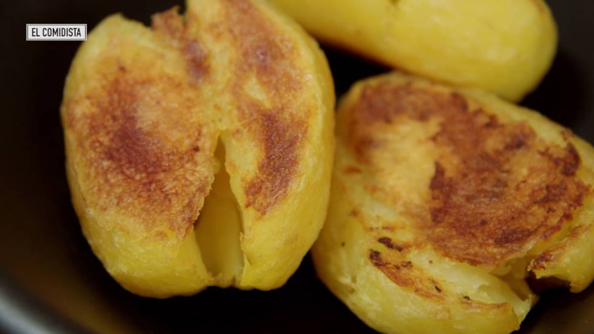 - Retirar la bandeja del horno y aplastar ligeramente cada patata con un masher o una espumadera.