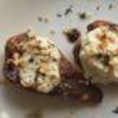 Fruta asada y caramelizada sin azúcar añadido, un chocolate potente y una crema con un toque suave de queso azul: un jetapostre de escándalo.