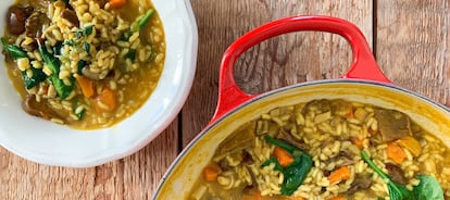 Otro truco para que un arroz de verduras quede con un punto más meloso es triturar parte de los vegetales que utilices. Esto me lo recordó nuestra Mónica Escudero, coordinadora comidista y reina de la pista, quien siempre nos deleita por estos lares con unos arroces de quitarse el sombrero. Además, puedes asar algunas verduras, como calabaza, berenjena o coliflor -según la receta- y triturarlas con un poco de caldo o agua para hacer una especie de puré espeso y añadirlo junto con el resto del caldo; la versión más simple pasa por hacer un caldo con cebolla y zanahoria y triturarlo todo para cocer el arroz en ese líquido. Recuerda que deberás tener en cuenta el agua que has utilizado para elaborar el puré cuando calcules la cantidad de líquido para hacer el arroz.