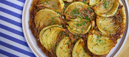 Lo bueno de que todo el mundo conozca tan bien el sabor de la receta, es que no es difícil imaginarse a lo que sabrá una tatin de sopa de cebolla: igual que sabría una cucharada de un buen bol, pero combinado con una masa con sabor a mantequilla tostada, crujiente y delicada. Para los despistados: la tarta Tatin es una preparación que normalmente se hace con manzanas que se caramelizan y colocan en una sartén. Después se cubren con masa quebrada, se hornea, y finalmente, se invierte revelando uno de los postres de manzana más bonitos y deliciosos del mundo. La misma técnica aplicada a la sopa de cebolla, es decir, a la cebolla caramelizada, es una de esas cosas que hay que probar al menos una vez en la vida.