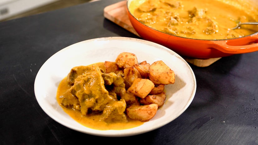 Volver a juntar la carne con la salsa y cocinar un par de minutos más. Servir con arroz o patatas fritas, asadas o cocidas.