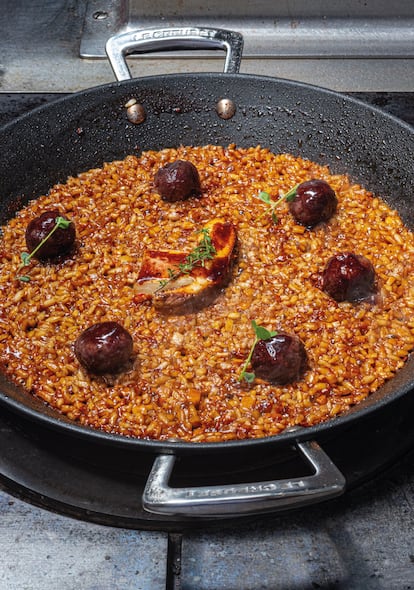Se finaliza el arroz colocando el boletus marcado en el centro y las albóndigas alrededor, napándolas con la reducción de vino que se ha retirado de la paella. Se presenta en la paella con una ramita de tomillo.