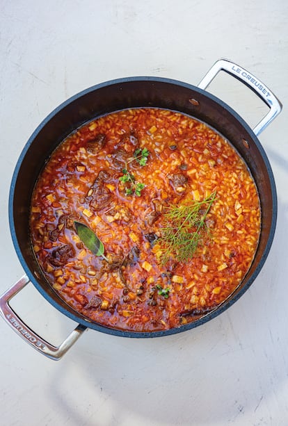 Cuando la carne esté tierna, se añade el arroz y se cuece durante 17 minutos.