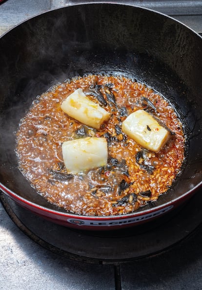 Se retiran el bacalao y las trompetas, y se coloca de nuevo la olla en el fuego.