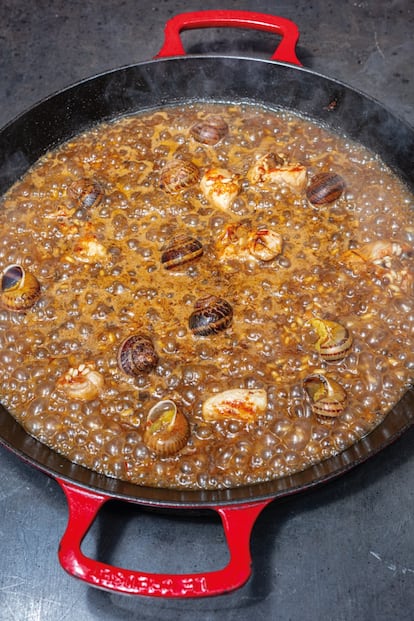 Sobre el minuto 8 se agregan los caracoles, y en el minuto 12 se añade el conejo y los brotes de romero y tomillo.