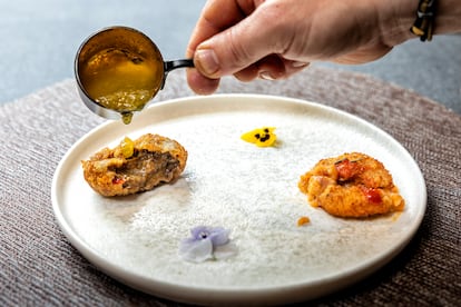 En la propuesta no faltan clásicos como los pimientos de piquillo rellenos de bacalao (11,50 euros), las almejas a la marinera (20,95 euros) o la merluza de pincho a la bilbaína (20,50 euros), pero su cocina destaca en los toques personales a elaboraciones tradicionales. Es el caso de las croquetas de rabo de toro, ideadas durante el confinamiento en la pandemia y que acompaña con una mermelada de piparras —”piparras en vinagre con azúcar, nada más”, apunta—. “Durante el encierro tenía a mi bloque de vecinos dándoles cosas para probar Tenía rabo de toro congelado que había guisado para el restaurante y dije ‘vamos a probar esto: piparras en vinagre con azúcar y hago una mermelada’ y a mí mujer le encantó”.
