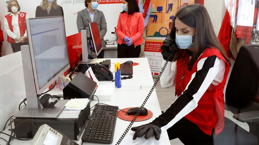 Vestida con el chaleco rojo y protegida con mascarilla y guantes, la esposa de Felipe VI ha visitado un centro de la organización en el que ha compartido su rutina de trabajo