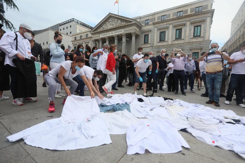 Más de 180 cocineros se han quitado las chaquetillas y las han depositado frente al Congreso de los Diputados en la mañana de este martes para reclamar medidas de apoyo a un colectivo que aporta el 6,2 % al PIB nacional y da empleo a 1,7 millones de personas. Los chefs se han reivindicado a través de un manifiesto en el que piden medidas específicas para un sector que forma parte del “tejido emocional” del país y que se enfrenta a una dura crisis provocada por la pandemia de coronavirus.
