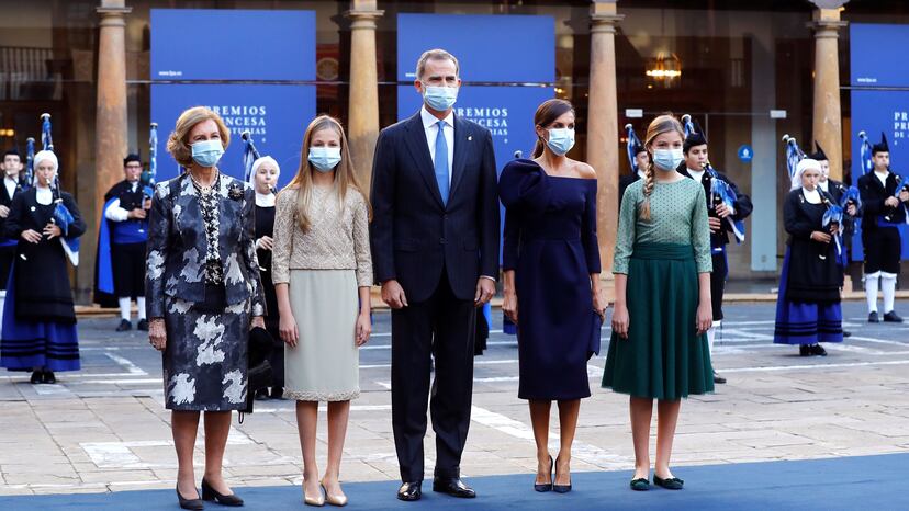 En su segundo año en los premios que llevan su nombre, Leonor de Borbón lució un vestido de cóctel beige con cuerpo de pedrería y de nuevo se subió a unos tacones. Su hermana Sofía optó por un dos piezas verde. Ambas como el resto de los asistentes llevaban mascarillas y guardaban la distancia obligada. Doña Sofía contempló la ceremonia desde un palco pero antes desfiló con los Reyes y sus hijas por la alfombra azul instalada en el recinto. Este año, como el pasado, la princesa tuvo un gesto cómplice con su abuela cuando miró hacia donde estaba ella al referirse a las personas “que queremos”. En su discurso resaltó como ella y su hermana Sofía han aprendido de sus padres el sentido de la responsabilidad.