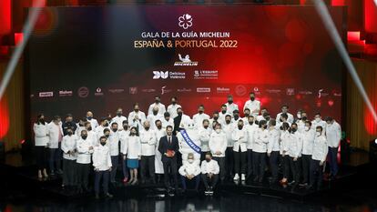 No hay ningún nuevo restaurante con tres estrellas en la Guía Michelin 2022 para España y Portugal, lanzada por fin en una gala presencial (aunque también retransmitida por la red) celebrada este martes en el Palau de las Artes de Valencia y con un colofón gastronómico de figuras de la comunidad, coordinadas por Quique Dacosta. A pesar de las decepciones de quienes esperaban entrar o ver crecer su brillo en el Olimpo de las estrellas, el sector ha celebrado feliz la fiesta de la gastronomía en la que ha sido la noche de los discursos largos y las chaquetillas cortas, pues ninguna parecía terminar de encajarle a su nuevo propietario.