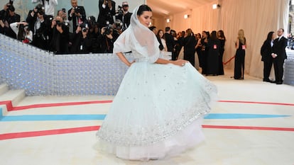 A diferencia de convocatorias anteriores, el reclamo de la Gala Met 2023 no ha sido una marca, una época o un concepto, sino una persona: Karl Lagerfeld. El diseñador, fallecido en 2019 a los 85 años, fue conocido tanto por sus bocetos para Chanel, Fendi, Chloé y su propia marca como por su personaje: pantalones pitillo con levitas, gafas negras, mitones bordados, coleta y su inseparable Choupette, “la Garbo de los gatos” en sus palabras, la gatita a la que legó parte de su fortuna. El hombre que “en el mundo de lo efímero fue alguien permanente”, como le definió la exmodelo Carla Bruni este lunes 1 de mayo en Nueva York; el “interesado por todo salvo por la mediocridad” alcanza halo de inmortal en una exposición que reúne casi 200 piezas, seleccionadas entre más de 10.000: la producción de una carrera que se prolongó seis décadas. La gala, con su pasarela galáctica de celebridades con Penélope Cruz ejerciendo como una de las anfitrionas, fue como de costumbre un alarde de fuegos de artificio —además de un evento de recaudación de fondos, su principal objetivo—, mientras la exposición del museo Metropolitano, que se abrirá al público el viernes hasta el 16 de julio, propicia el encuentro silencioso con la esencia del genio.