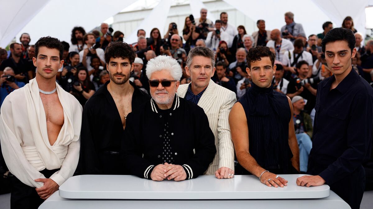 Almodóvar regresa a Cannes con un batallón de guapos y una bomber finamente ribeteada con brillos, que le pediré prestada, para presentar su mediometraje sobre vaqueros enamorados que se reencuentran en su madurez, un giro de tuerca para el wéstern y también para su propia cinematografía.