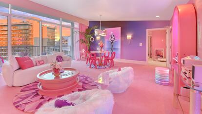Rosa, rosa, rosa, rosa. El mundo de Paris Hilton se alimenta del color rosa. Todo lo que puede ser rosa lo es, y lo que parecería imposible, también. Sumergirse en el particular universo de la cantante, heredera, estrella de la telerrealidad y personaje consagrado —amado u odiado, pero constante— de la cultura americana es entrar de lleno en una fantasía de luz y de color. Brillo, pelo, lentejuelas, metacrilato y todas las variaciones del rosa, del palo al fucsia, pasando por bronces y malvas, son los elementos sobre los que ha forjado su imagen pública, pero realmente son su vida. Y así lo plasma en un nuevo proyecto, muy vinculado a sus raíces. La neoyorquina de 43 años se ha aliado con la cadena hotelera que lleva su apellido para diseñar dos habitaciones donde reflejar su vida y para que sus fans (tiene casi 27 millones de seguidores solo en Instagram) puedan vivir por un día cómo es ser, dormir, bañarse y desayunar como Paris Hilton. La experiencia, eso sí, es limitada, porque durará solo el mes de octubre, y tiene un precio, también muy Paris Hilton: 1.111 dólares la noche.