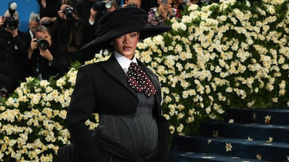 La cantante se ha dejado ver poco antes de la alfombra roja del evento de moda más importante del año en la que posó la última, cuando ya parecía haber acabado. Allí ya su estado, vestida con un ajustado traje negro de raya diplomática y sombrero a juego, firmados por Marc Jacobs, era innegable. Además, fuentes cercanas a ella y a su pareja, el músico A$AP Rocky, coanfitrión de la gala de este año, centrada en el dandismo negro, confirmaron la noticia a varios medios estadounidenses.