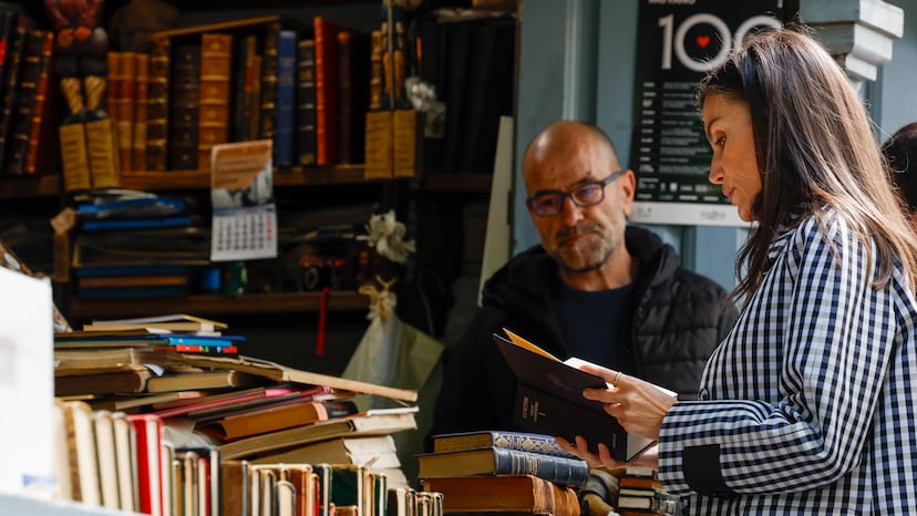 Dicen, quienes conocen del tema, que las gallinas con frío ponen menos huevos. También cuando llueve o cuando hace calor. Algo similar viven los libreros de la Cuesta de Moyano, esa feria del libro permanente al aire libre a un costado del Jardín Botánico de Madrid, que llevan un siglo capeando el temporal y diversas vicisitudes para vender sus libros. Y este año cumplen 100 años haciéndolo. Sus casetas grises resisten, estoicas, abiertas todos los días del año, siempre a la espera de algún lector o bibliófilo en busca de ediciones descatalogadas, novedades, o libros de ocasión que conviven en un meticuloso desorden. Este viernes ha llegado hasta ahí la reina Letizia para recorrer de arriba abajo los 30 puestos, en un acto más de los muchos organizados para celebrar el centenario de la cuesta, que se cumple este domingo.