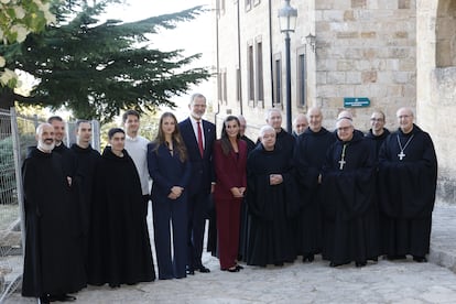 La siguiente parada ha sido Viana, donde tras la visita al Ayuntamiento —con firma en el libro de honor y saludo a los curiosos desde el balcón del Consistorio— han recorrido una exposición en las ruinas de San Pedro —el primer templo que se levantó en el siglo XIII en la por entonces villa— dedicada al sexto centenario del propio título nobiliario. Al igual que han hecho previamente en Pamplona, se han sacado fotos con muchos de los vecinos allí reunidos y han departido un rato con ellos. Por la tarde ha sido el turno de Yesa y el monasterio de San Salvador de Leyre, donde Leonor ha realizado una ofrenda floral en el panteón que acoge la arqueta neogótica en la que están los restos de los monarcas navarros más antiguos. El repique de campanas del principal monumento románico de la comunidad ha anunciado su llegada, y han accedido a él mientras sonaba la Marcha Real. El recorrido ha incluido la cripta románica, donde los Reyes y la princesa de Viana han conocido a los monjes benedictinos. “Como princesa de Viana, quiero agradecer a la comunidad benedictina su entrega a la custodia de este legado tan significativo para la historia de España”, ha escrito la princesa Leonor en el libro de honor de visitas del monasterio.