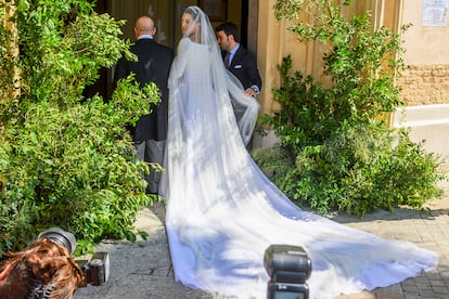 La novia, que ha elegido para la ocasión un vestido diseñado por Navascués, ha llegado una media hora después a la iglesia junto a su padre —también el padrino de la boda—, en un coche de caballos descubierto propiedad de la Casa de Alba, llamado La duquesita. En el vestido, confeccionado en crep con cortes en godets de organza bordada con hilos de seda, había unos bordados de la Virgen de las Angustias de la hermandad de los Gitanos, a la que Cayetana de Alba profesó una profunda devoción, según ha informado la propia firma. Además, llevaba una pulsera convertida en diadema de la joyería Grassy y unos pendientes de estilo art déco, regalo de su pareja para el día.