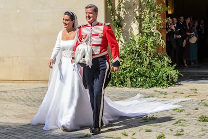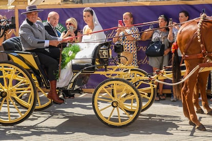 Poco antes de las tres de la tarde salían de la iglesia ya como marido y mujer. Sin posar ante las decenas de cámaras que les esperaban, juntos se han subido al mismo coche de caballos con el que ha llegado la novia, quien ya no llevaba su ramo, pues lo ha dejado como ofrenda en la capilla donde están los restos de Cayetana de Alba. “Dejadnos tranquilos hoy, un poco de respeto. Respeto una vez en la vida”, decía Cayetano Martínez de Irujo, un tanto nervioso, a los numerosos periodistas que les acercaban los micrófonos para preguntarles sobre su boda.