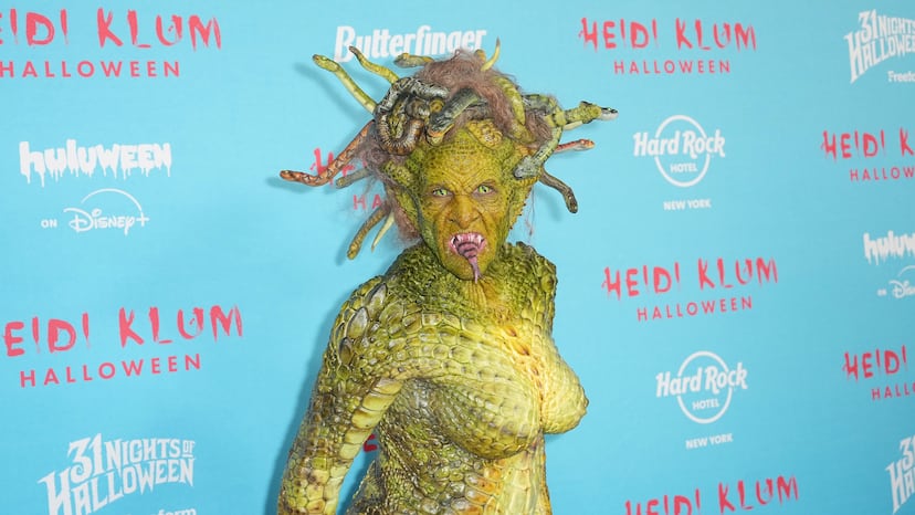 La reina de Halloween ha vuelto a hacerlo. Como cada año, Heidi Klum se ha disfrazado para la gran fiesta del terror estadounidense y, esta vez, ha decidido dar auténtico miedo: ella ya lo advirtió, y lo ha cumplido. De ahí que la modelo y presentadora alemana, de 52 años, se haya convertido en la sensación de la noche con un disfraz de medusa verdosa, con un nido de serpientes en movimiento como tocado (y alguna más enroscada sobre su cuerpo). A la germana ni siquiera se le veían las piernas ni los pies, cubiertos del cuerpo de medusa, lleno de verdes escamas.