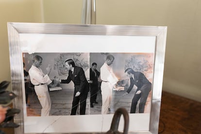 Lo primero que uno ve al entrar en la casa de Jaime Peñafiel (Granada, 93 años) es una cristalera desde la que se puede admirar toda la Casa de Campo. Desde el piso del periodista, en lo más alto de una torre, se aprecia hasta el último rincón de este frondoso bosque que alguna vez sirvió de patio de juegos de los reyes de España. Lo segundo que uno observa es un mueble de cristal repleto de portarretratos. Son fotografías del anfitrión, el reportero número uno de la prensa del corazón durante décadas, con algunos de sus amigos y conocidos más ilustres: los reyes Juan Carlos I y Sofía, Carlos de Inglaterra, el fallecido duque de Edimburgo, los príncipes Rainiero y Grace de Mónaco, el sha Reza Pahlevi y la emperatriz Farah Diba, Felipe González y Carmen Romero… “No quiero vivir en el recuerdo porque eso me parece decadente, pero tengo tantos recuerdos”, reconoce.