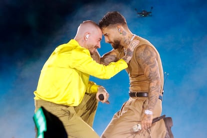 El emotivo encuentro de rodillas y entre abrazos de Maluma y J Balvin: “Eres un hermano para mí. La gente estaba esperando vernos juntos”