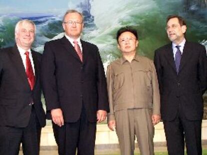 Por la izquierda, el comisario Chris Patten; el primer ministro sueco, Göran Persson; el presidente Kim Jong II, y Javier Solana, <i>mister Pesc</i>, ayer en Pyongyang