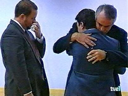 Imagen de TVE de Joaquín José Martínez abrazando a su abogado Peter Raben, junto a su otro letrado, David Parry.